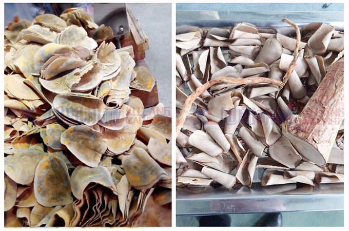入 料:將木質壓模取出,調整好切片厚度,開啟機械后,將物料放入進料口中即可